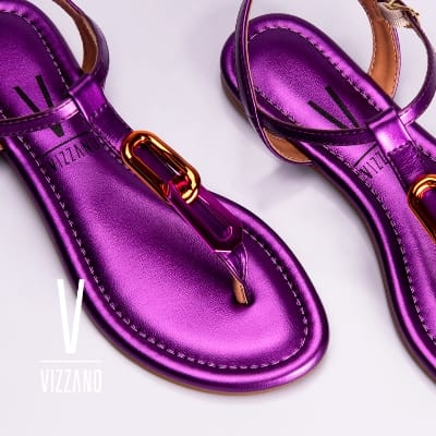 É o calçado ideal para os dias mais quentes com detalhe em material metálico, o que traz todo charme ao calçado. Sua palmilha é acolchoada, forrada por Napa de alta qualidade. A sola e entressola são feitos em EVA com frisos antiderrapantes para mais segurança.